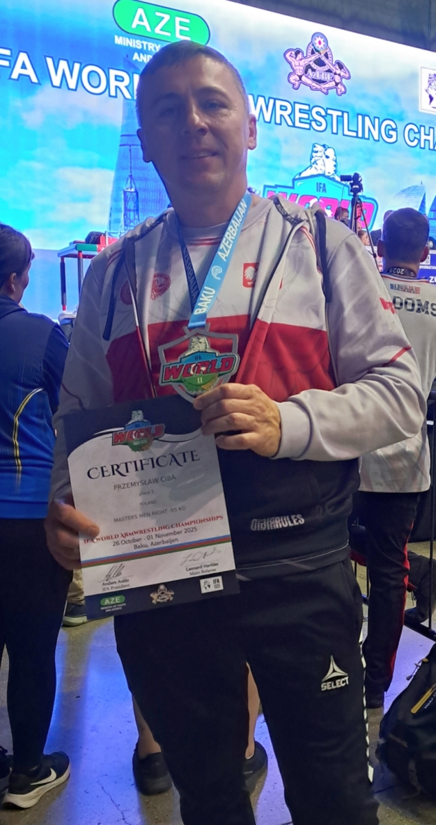 Przemysław Ciba wystartował w kategorii Masters 95 kg. Pierwszego dnia zawodów, po zaciętych pojedynkach, uplasował się tuż za podium, zajmując czwarte miejsce. W rywalizacji na prawą rękę przeszedł jednak do finału, zdobywając tytuł wicemistrza świata IFA.
